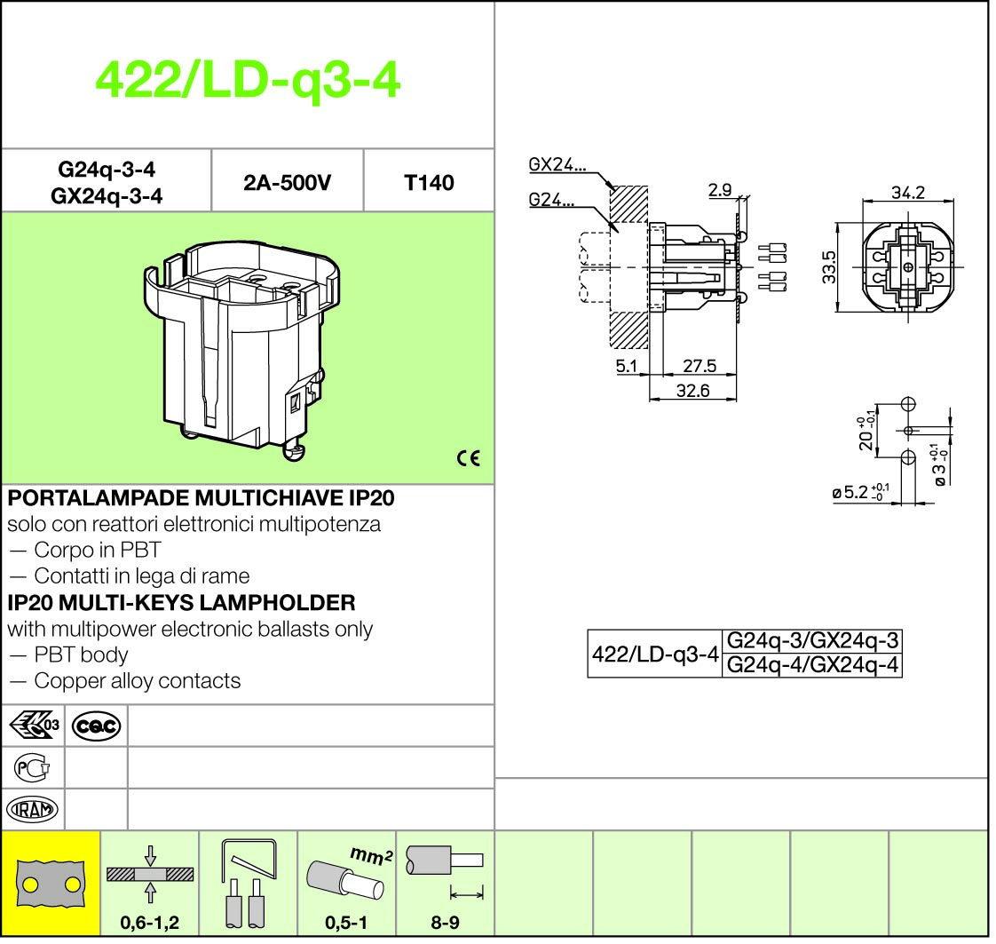 422/LD-q3 -q4 (200db) G24q-3-4-es bepattintható kompaktfénycső-foglalat