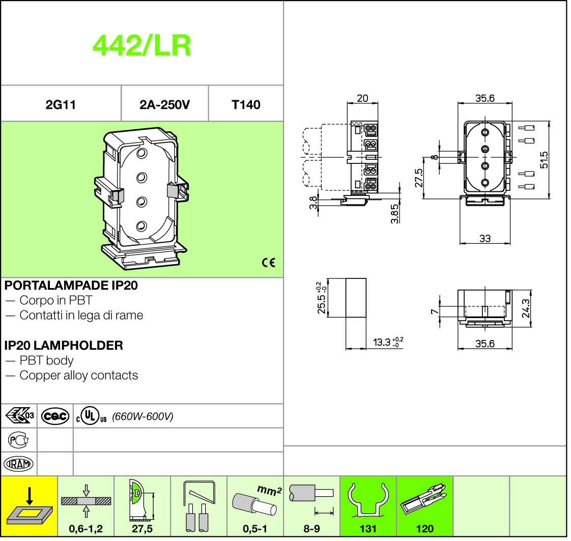 442/LR (500db) 2G11-es téglánykivágásba bepattintható kompaktfénycső-foglalat