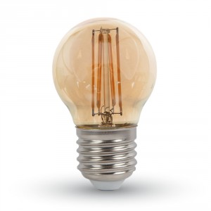 Izzószál-utánzatú, borostyán színű LED gömb burás lámpa, 4W, G45, E27, 350lm, 300 °, 2200K, meleg fehér, 230V, (VT-1957)